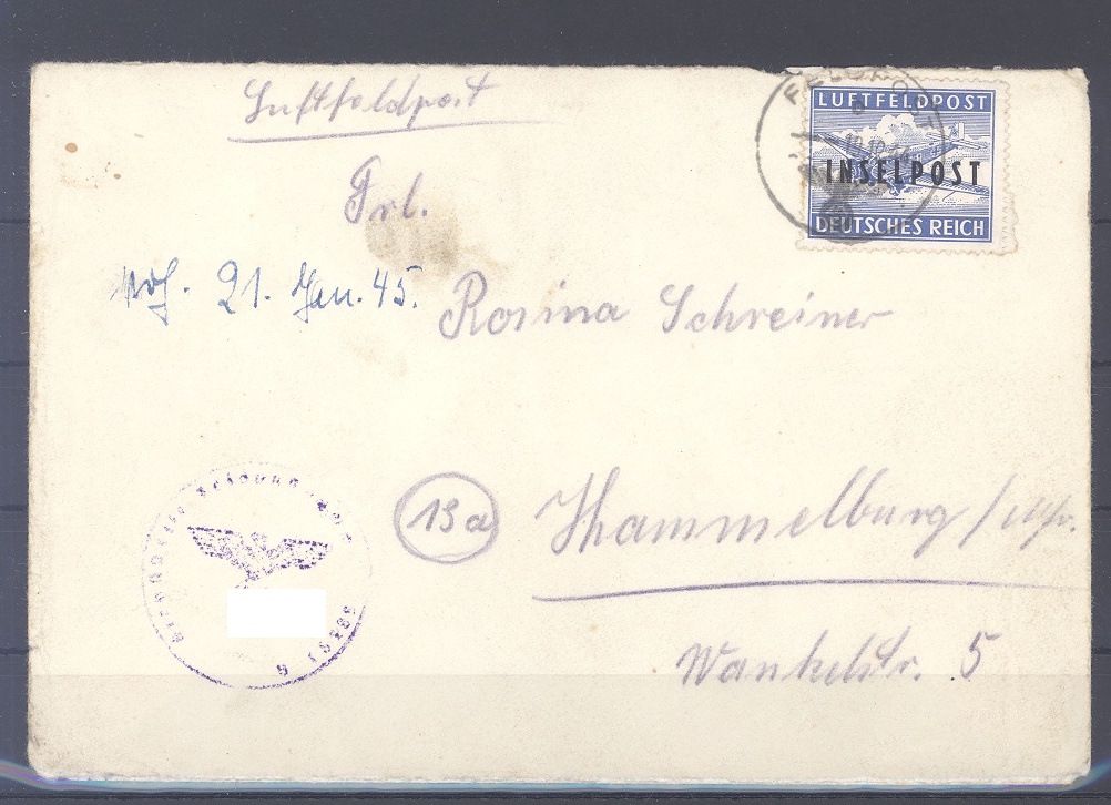 Deutsche Feldpost Inselpost Rhodos, interessanter Brief vom 19.12.1944 frankiert mit Michel Nummer 8 B als EF gelaufen. Selten einmal angeboten!