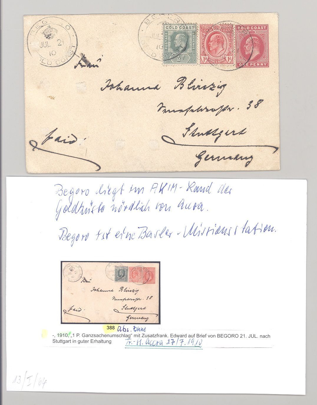 Deutsche Kolonien Kamerun Goldküste, saubere gelaufene GA aus Begoro nach Stuttgart gelaufen, war wohl mal ein Auktionslos. Nette Ergänzung zur Sammlung!