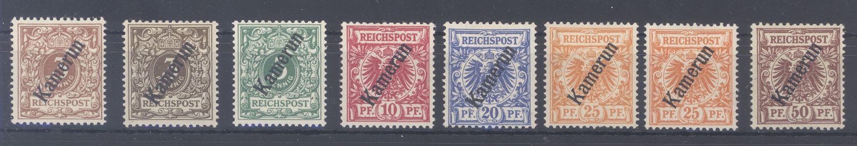 Deutsche Kolonien Kamerun Michel Nummer 1/6, Freimarken 1897/99 überkomplett ungebraucht *, die 3 Pfg. und 25 Pfg. ist in zwei Farben vorhanden.