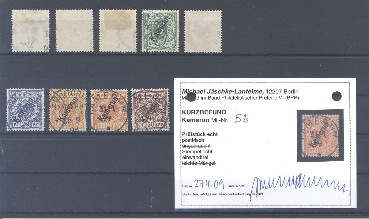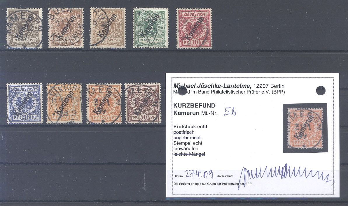 Deutsche Kolonien Kamerun Michel Nummer 1/6, Freimarken 1897/99 weit überkomplett gestempelt mit auch vielen geprüften Werten und einem Befund BPP, ist mit eingescannt. Nett!