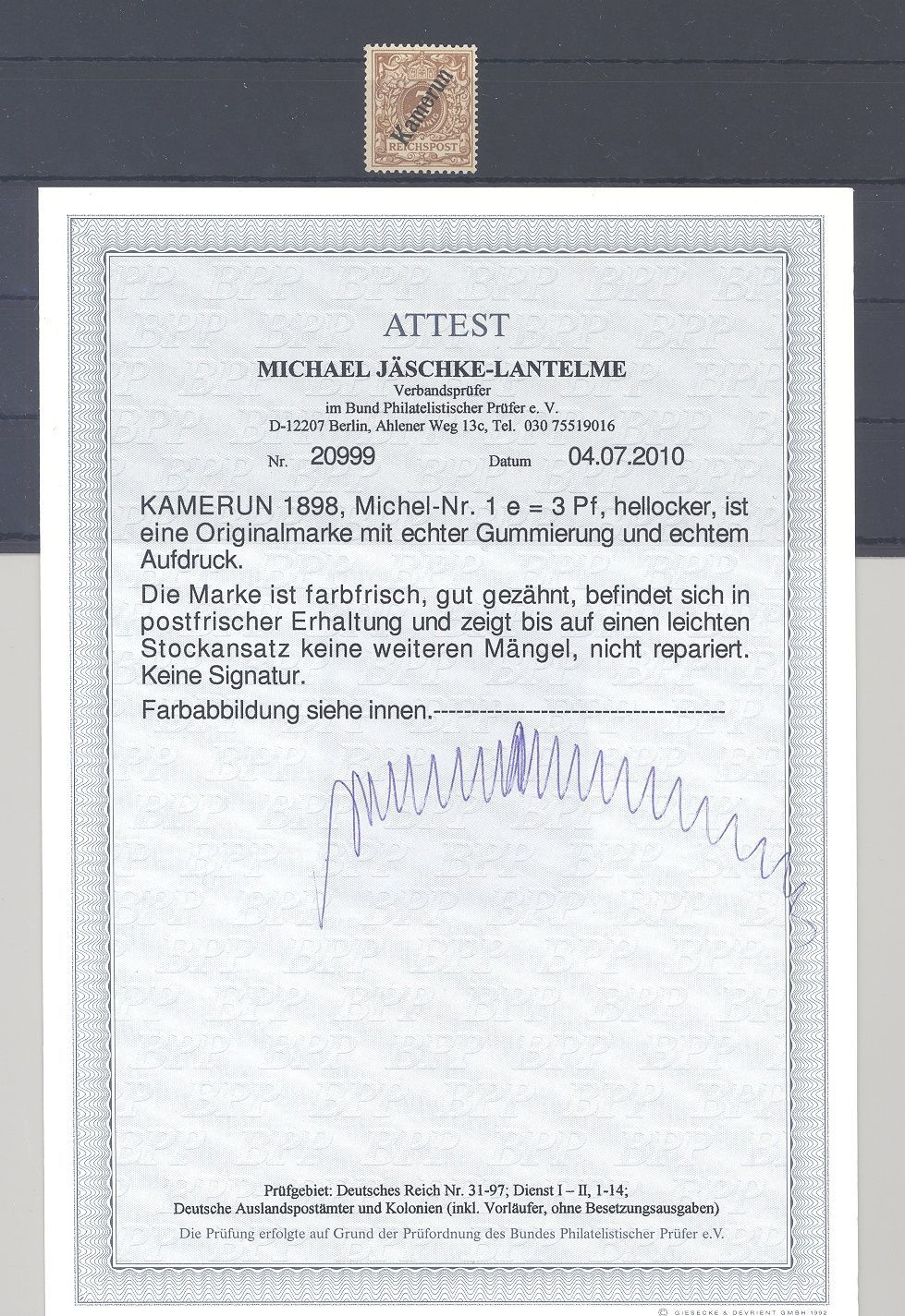 Deutsche Kolonien Kamerun Michel Nummer 1e, die 3 Pfg. Freimarke 1897/99 in der besseren Farbe e **, bis auf einen leichten Stockansatz ein schöner Wert. Es liegt ein FA BPP vor, hat bereits einiges gekostet, ist mit eingescannt.
