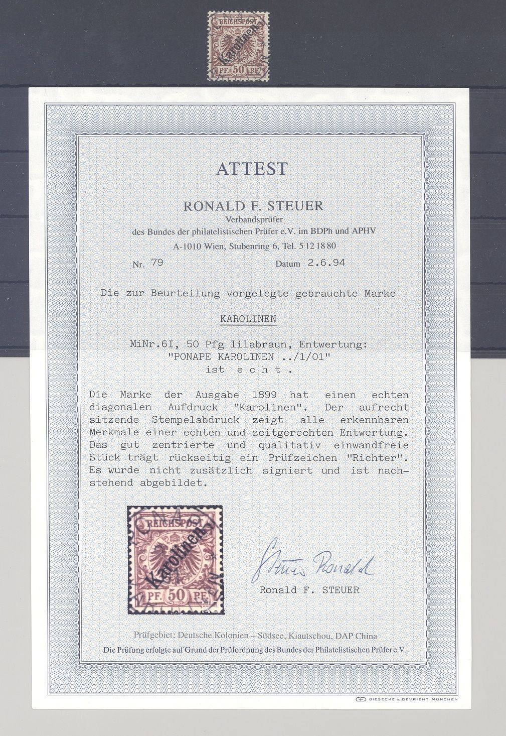 Deutsche Kolonien Karolinen Michel Nummer 6 I, 50 Pfg. Freimarke 1899/1900 gestempelt, ein sehr schöner Wert mit klarem, zentrischen Stempel. Es liegt ein FA BPP vor, hat bereits einiges gekostet, ist mit eingescannt, selten einmal angeboten!