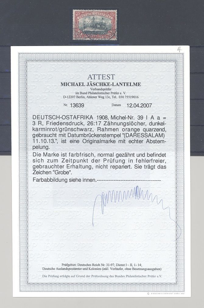 Deutsche Kolonien Ostafrika Michel Nummer 39 I A a, 3 Rupie 1905/22 gestempelt. Es liegt ein FA BPP vor, ist mit eingescannt, hat bereits einiges gekostet.