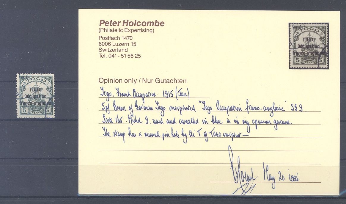 Deutsche Kolonien Togo Französische Besetzung Michel Nummer 9, 5 Pfg. Freimarke 1915 gestempelt. Es liegt ein Befund Holcombe vor, ist mit eingescannt, selten einmal angeboten!