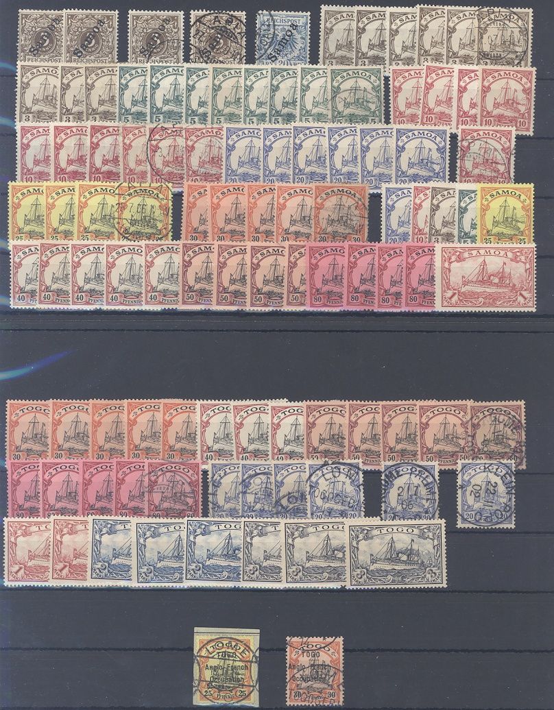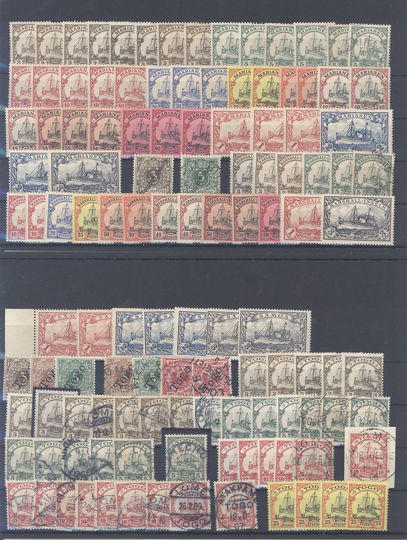 Deutsche Kolonien, umfangreicher Posten auf vier Steckkarten, einfach zusammengesteckt mit auch zwei Werten Togo Franz. Besetzung. Vollkommen unberechnet, sollte bereits aufgrund der Materialfülle ein nettes Schnäppchen sein...