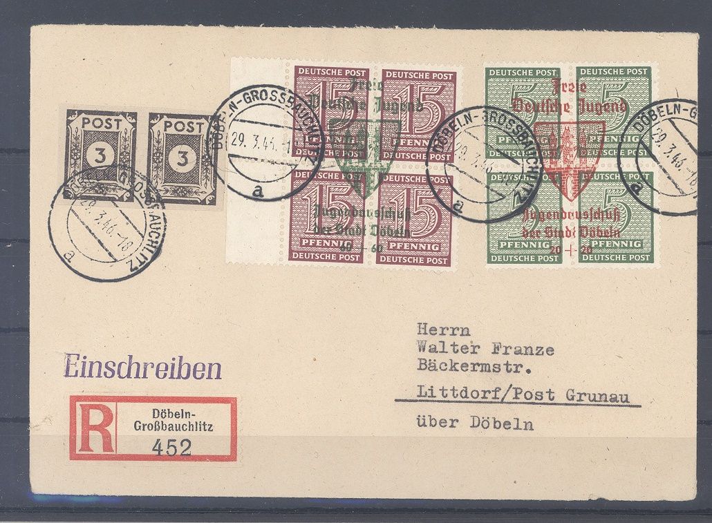 Deutsche Lokalpost Döbeln Michel Nummer 2/3, die beiden Viererblöcke 1946 auf Brief mit rückseitigem Ankunftsstempel. Der Brief Michel beträgt 200,00 Euro, nett!
