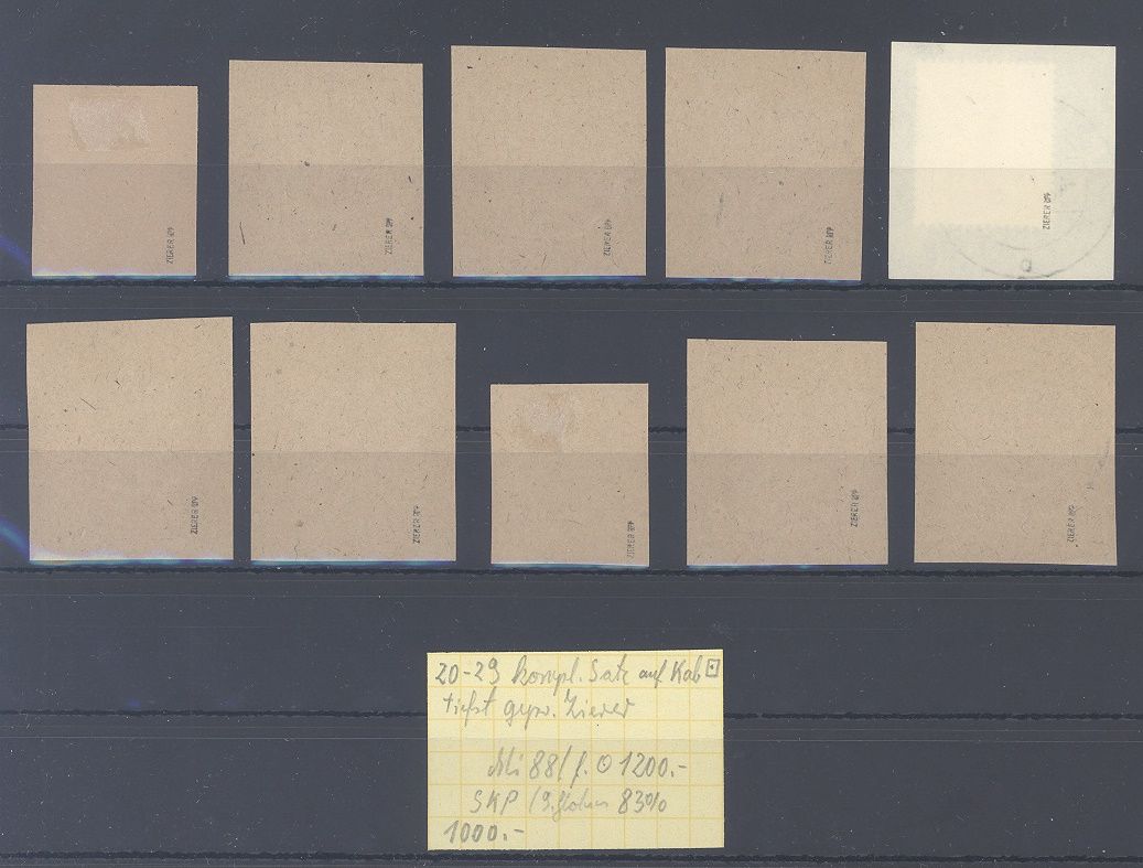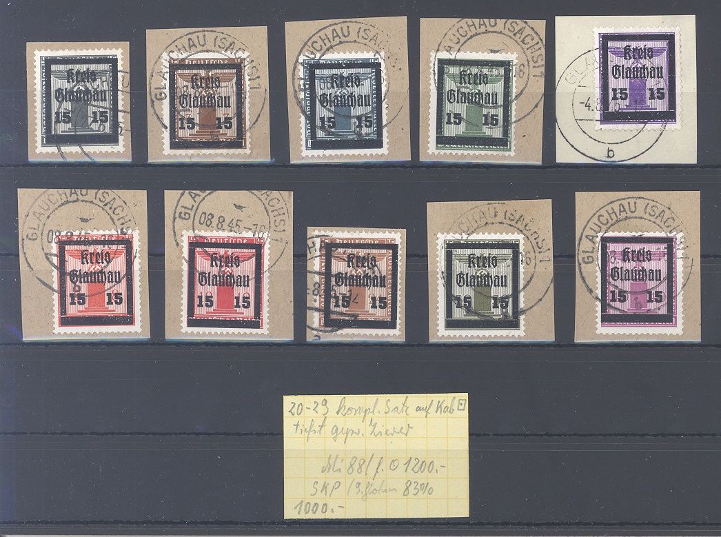 Deutsche Lokalpost Glauchau Michel Nummer 20/29, Freimarken 1945 gestempelt auf Briefstücken, jeder Wert ist geprüft mit Altprüfung. Der Zettel des Sammlers ist mit dabei, hatte wohl einmal 1000 DM gekostet