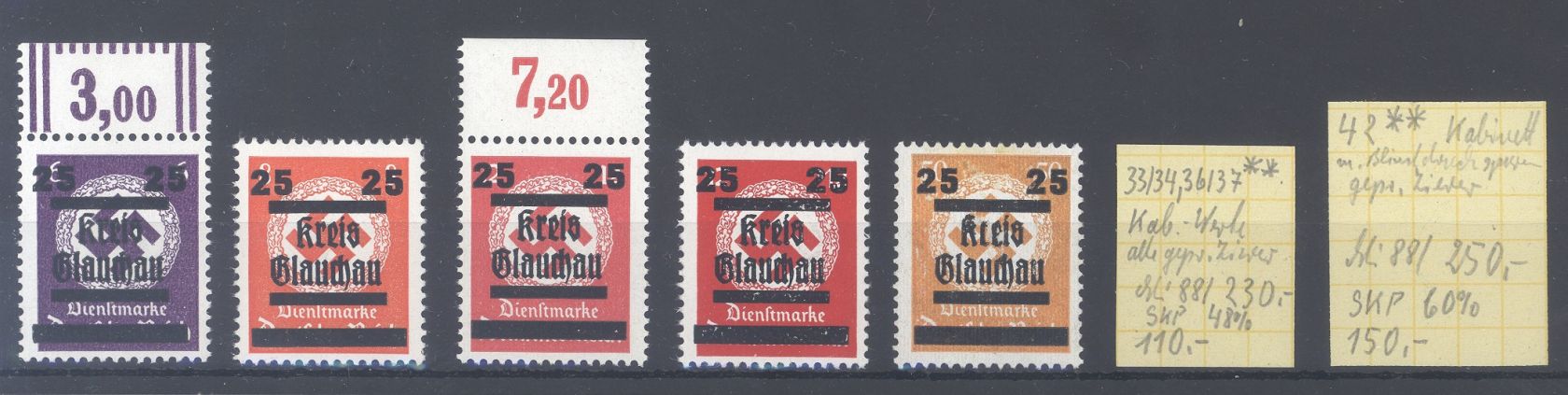 Deutsche Lokalpost Glauchau Michel Nummer 33, 34, 36, 37 und 42 aus Freimarken 1949 **, jeder Wert ist geprüft mit Altprüfung. Der Zettel des Sammlers ist mit dabei, hatte wohl einmal 260 DM gekostet.