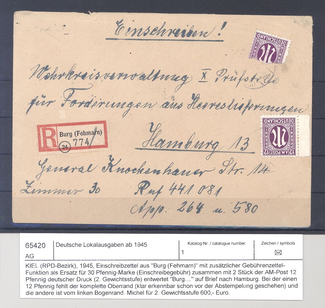 Deutsche Lokalpost Kiel, interessanter Einschreib - Brief frankiert mit 2 x 12 Pfg. als MeF aus Burg nach Hamburg mit rückseitigem Ankunftsstempel gelaufen. War wohl einmal ein Auktionslos, die Beschreibung ist mit beigefügt, selten einmal angeboten!