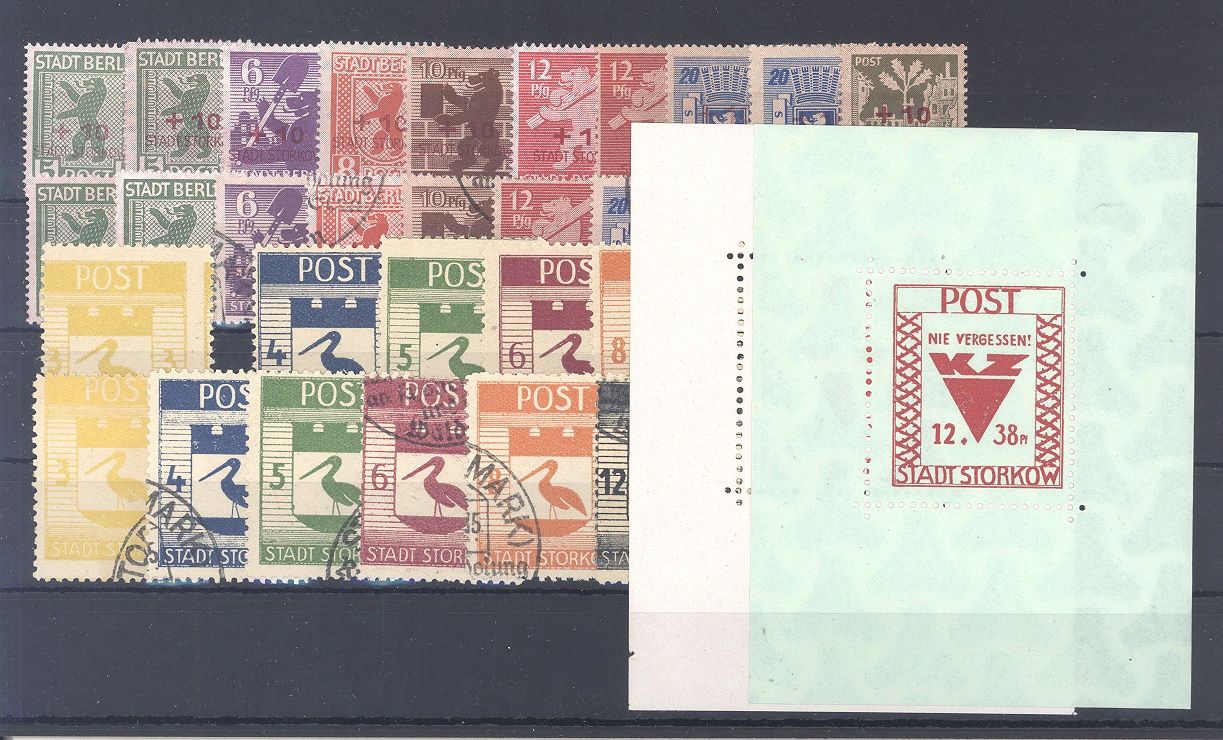 Deutsche Lokalpost Storkow, **/gestempelter Posten auf Steckkarte. Es sind die Michel Nummern 1/14 ** und gestempelt sowie die Blöcke 1/2 ** vorhanden.