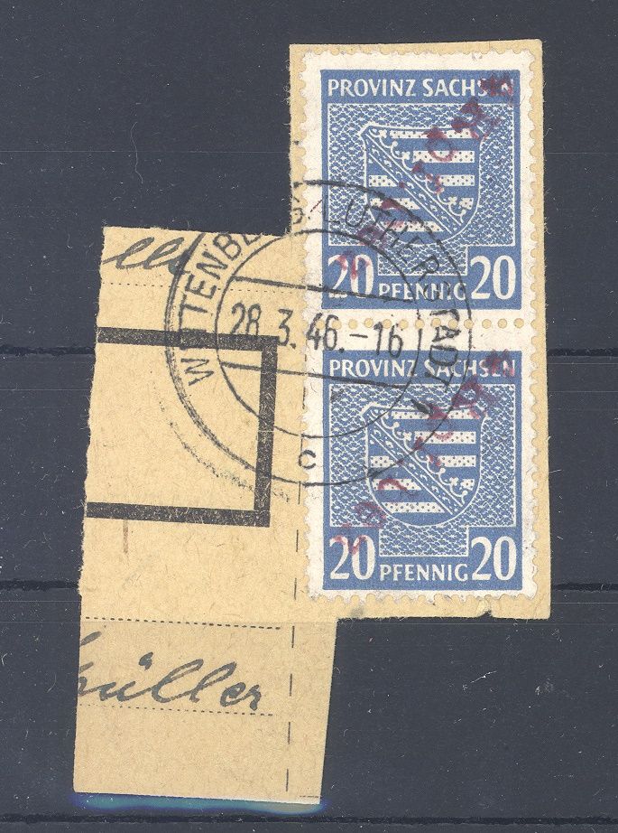 Deutsche Lokalpost Wittenberg Michel Nummer 21 K II als gestempelter Viererstreifen auf Paketkarten Briefstück, zwei Werte auf der Vorderseite und zwei Werte auf der Rückseite. Die lose gestempelten Marken werten mit 400,00 Euro, nette Ergänzung zur Sammlung!