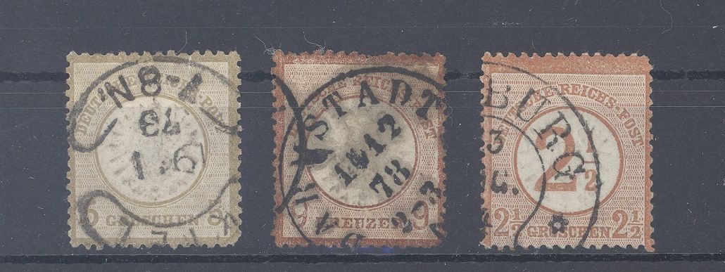 Deutsches Reich, drei bessere Brustschildwerte mit Mängeln, aber schönen Stempeln als Posten. Es sind die Michel Nummern 22, 27 und 29 vorhanden.