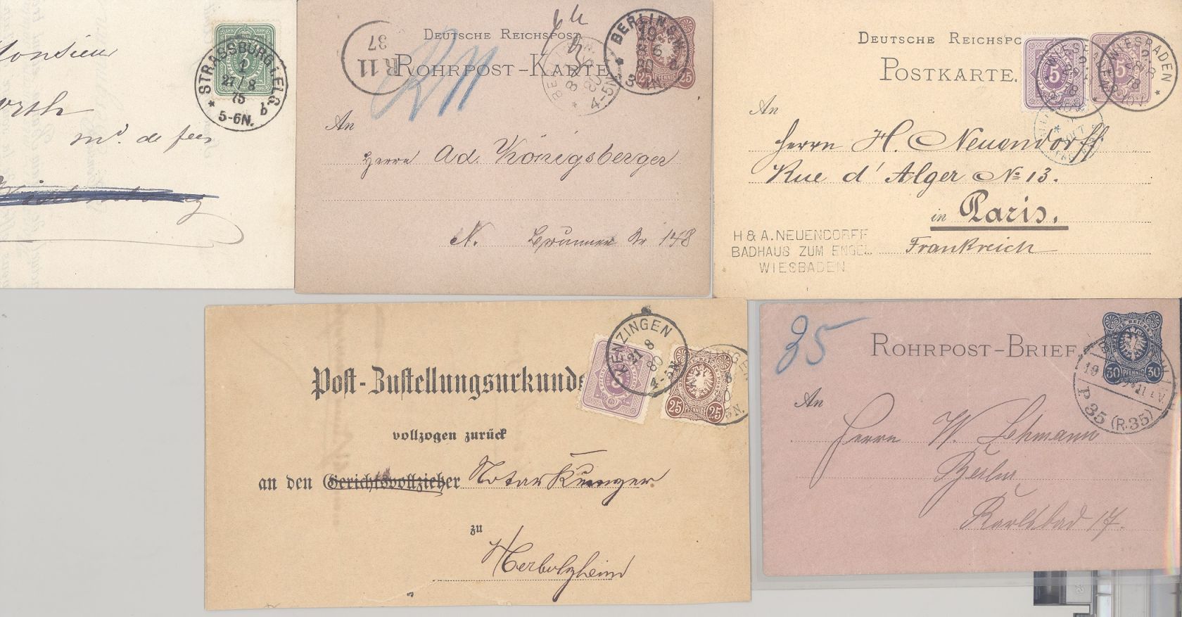 Deutsches Reich, fünf verschiedene interessante und dekorative Belege als Posten, dabei Rohrpost, ein Brief aus Strassburg nach Weissenburg / Elsass gelaufen, eine GA mit ZuF nach Paris und eine Zustellungsurkunde mit 25 Pfge. MiF. Hingucker!