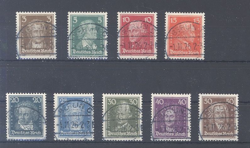 Deutsches Reich, acht Werte aus Michel Nummer 385/97, Berühmte Deutsche 1926 mit Ersttagsstempel. War ein Auktionslos mit 190,00 DM Zuschlag zzgl. 20 % Aufgeld.