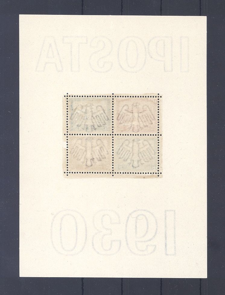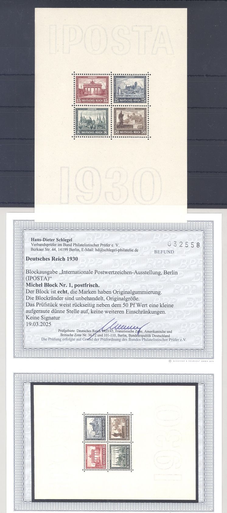 Deutsches Reich Block 1, IPOSTA Block 1930 ** mit einer kleinen dünnen Stelle, sonst und insgesamt aber ein ordentlicher Block. Es liegt ein Befund BPP vor, hat bereits einiges gekostet, ist mit eingescannt.
