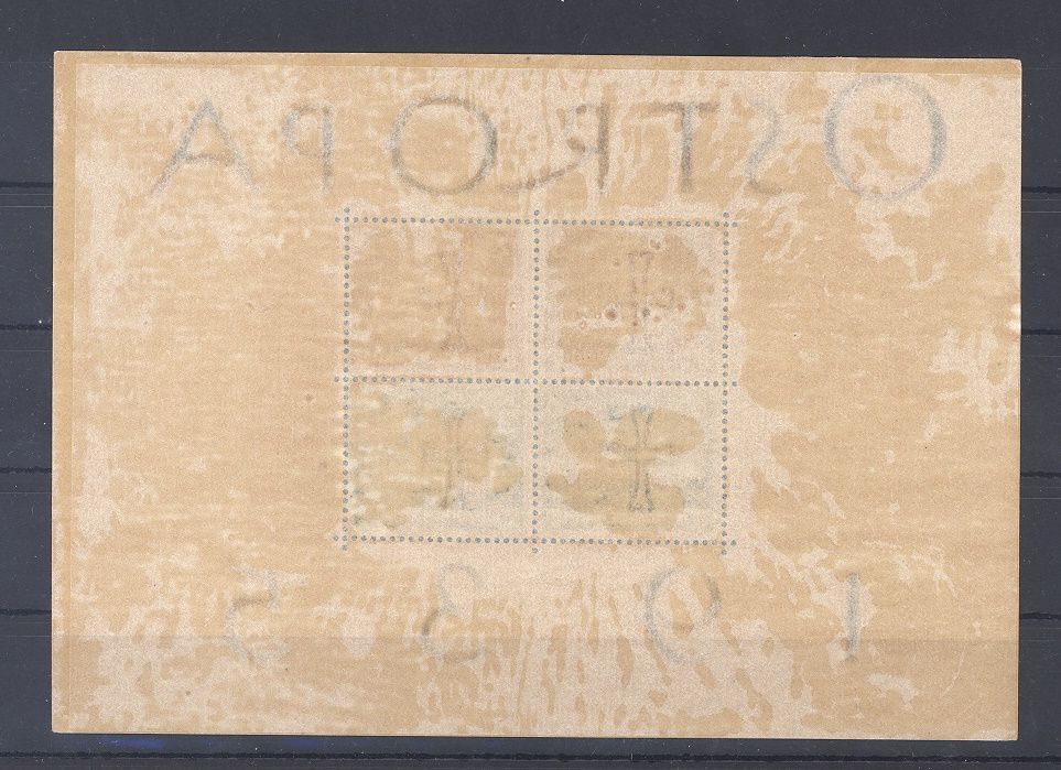 Deutsches Reich Block 3, der Ostropa Block 1935 ungebraucht mit Gummierung, allerdings befindet wohl zum Schutz des Blockes und der Gummierung ein dünne Pergaminfolie, daher ist diesmal die Rückseite eingescannt . Der Michel für ungebraucht (*) beträgt 1.300,00 Euro.