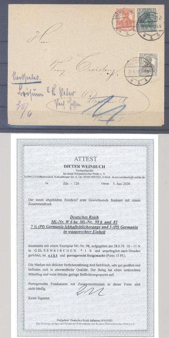 Deutsches Reich, sauberer Brief portogerecht frankiert mit u.a. Zusammendruck Michel Nummer W 6 ba, Germania in Bedarfserhaltung aus Gelsenkirchen gelaufen. Es liegt ein Befund BBP vor, hat bereits einiges gekostet, ist mit eingescannt.