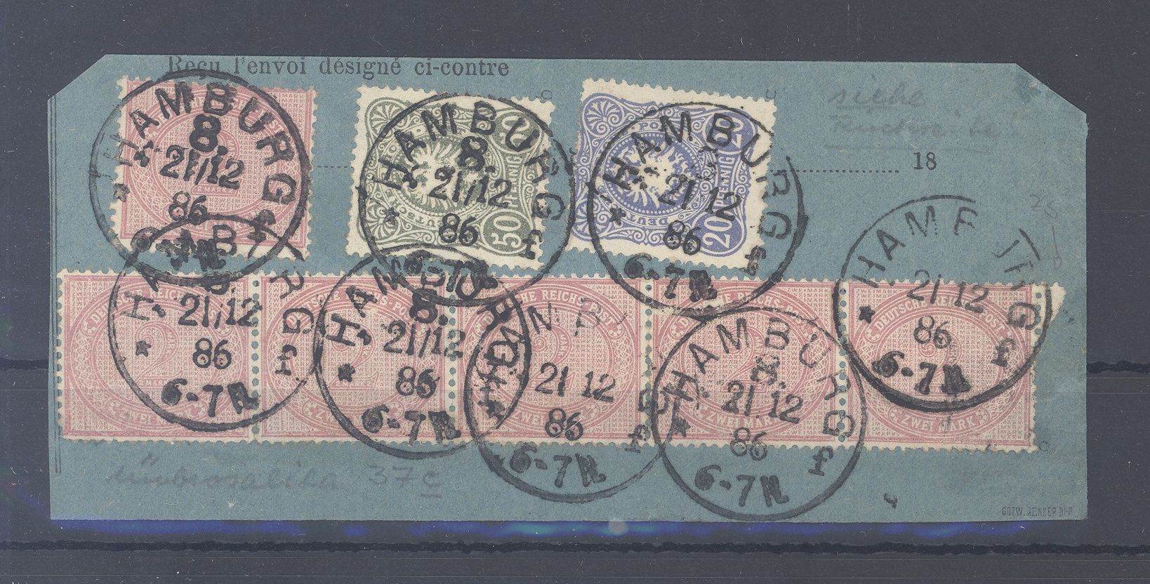 Deutsches Reich, sehr dekoratives Briefstück bestückt mit Fünferstreifen Michel Nummer 37c, 2 Mark 1875 in der Farbe c aus Hamburg sehr schönen Stempeln. Sehr schöne Ergänzung zur Sammlung!