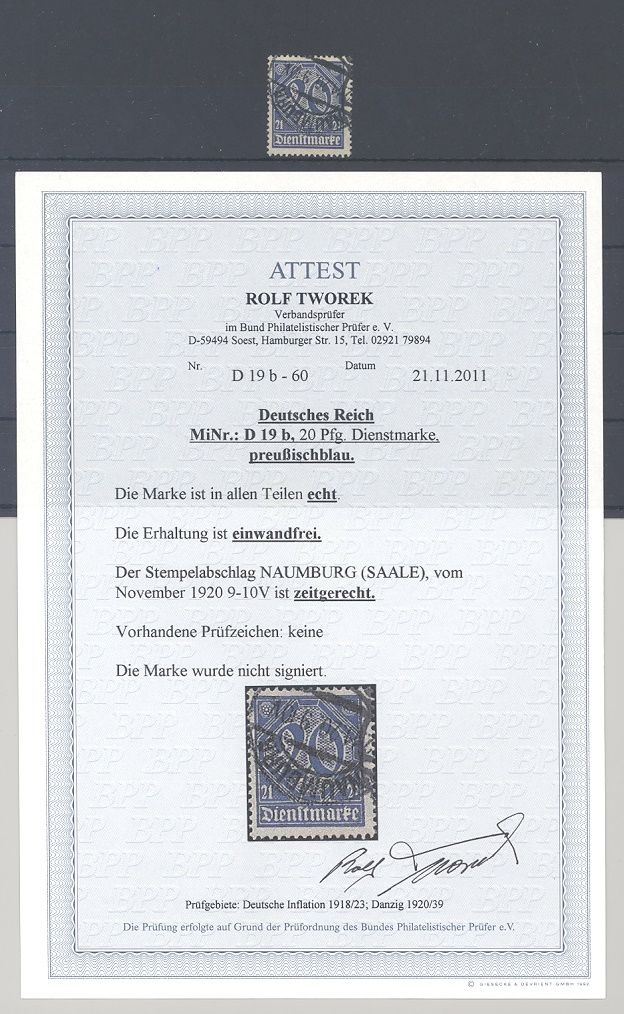 Deutsches Reich Dienst Michel Nummer 19b, 20 Pfg. Freimarken 1920 in der Farbe b gestempelt, ein schöner Wert. Es liegt ein Befund BPP vor, ist mit eingescannt, hat bereits einiges gekostet.