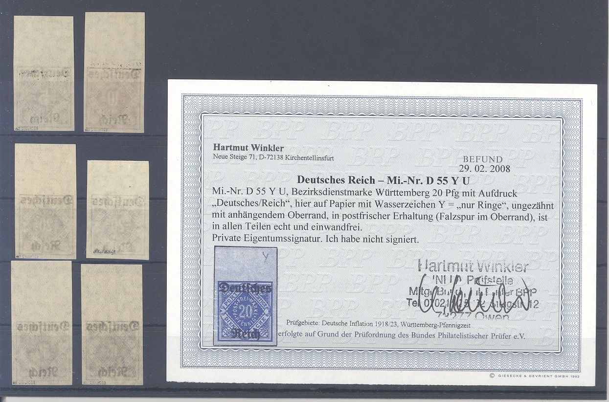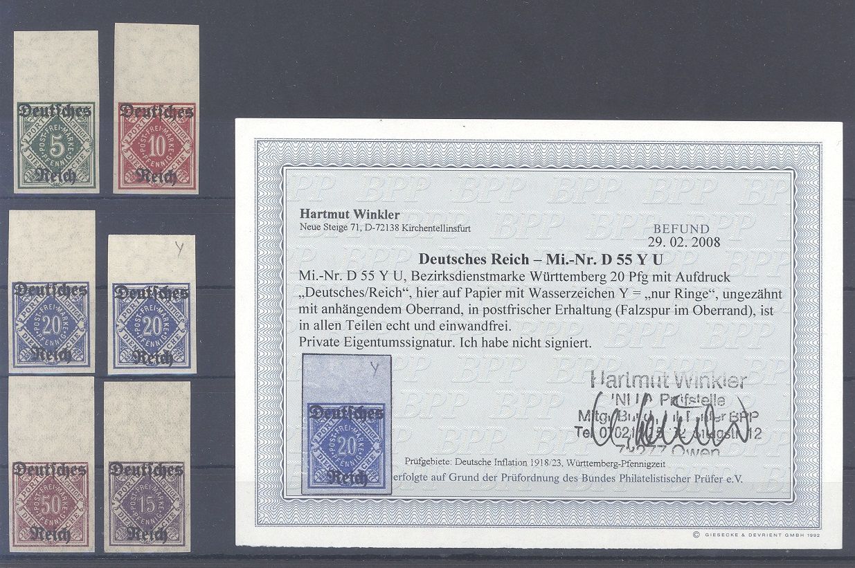 Deutsches Reich Dienst Michel Nummer 52/56, Freimarken 1920 ungezähnt **, sogar auch die Michel Nummer 55 Y. Ein toller Satz vom Oberrand, jeder Wert ist geprüft BPP bzw. Befund BPP, selten einmal angeboten!