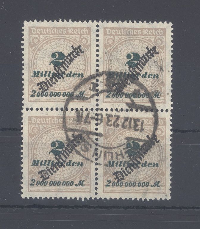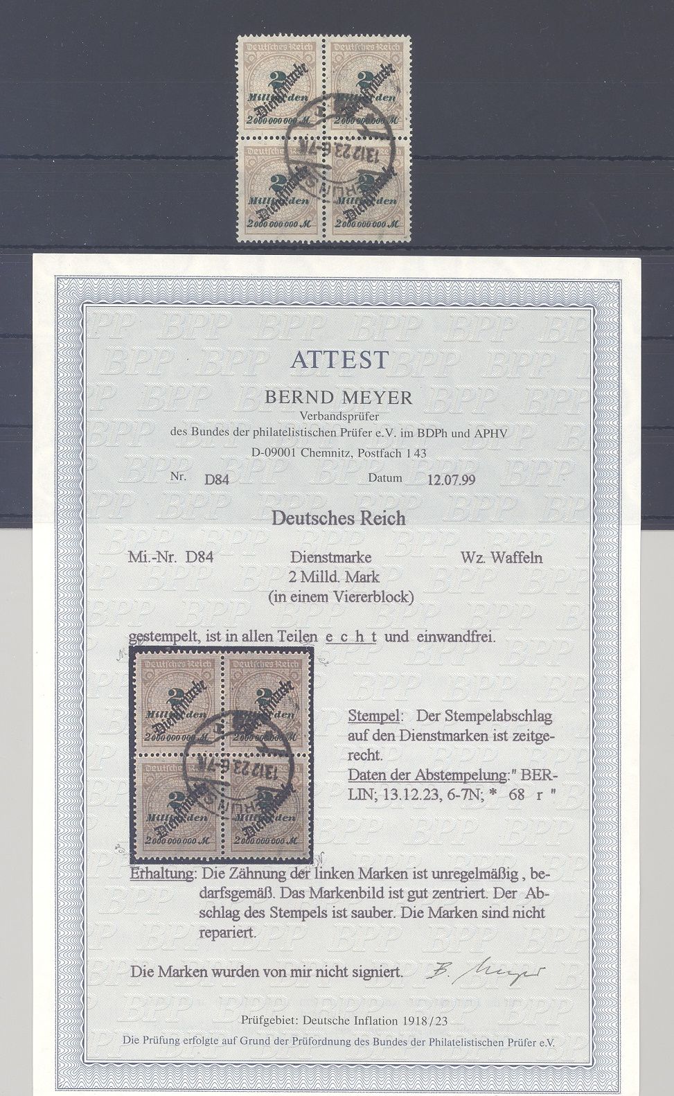 Deutsches Reich Dienst Michel Nummer 84, 2 Mrd. Freimarke 1923 als Viererblock in sehr ordentlicher Bedarfserhaltung gestempelt. Es liegt ein FA BPP vor, hat bereits einiges gekostet.