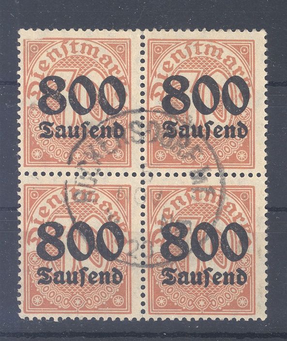 Deutsches Reich Dienst Michel Nummer 95y, 800 Td. Dienst Freimarke 1923 in der guten Y Variante als gestempelter Viererblock. Jeder Wert ist geprüft Infla und BPP, in dieser Form selten einmal angeboten!