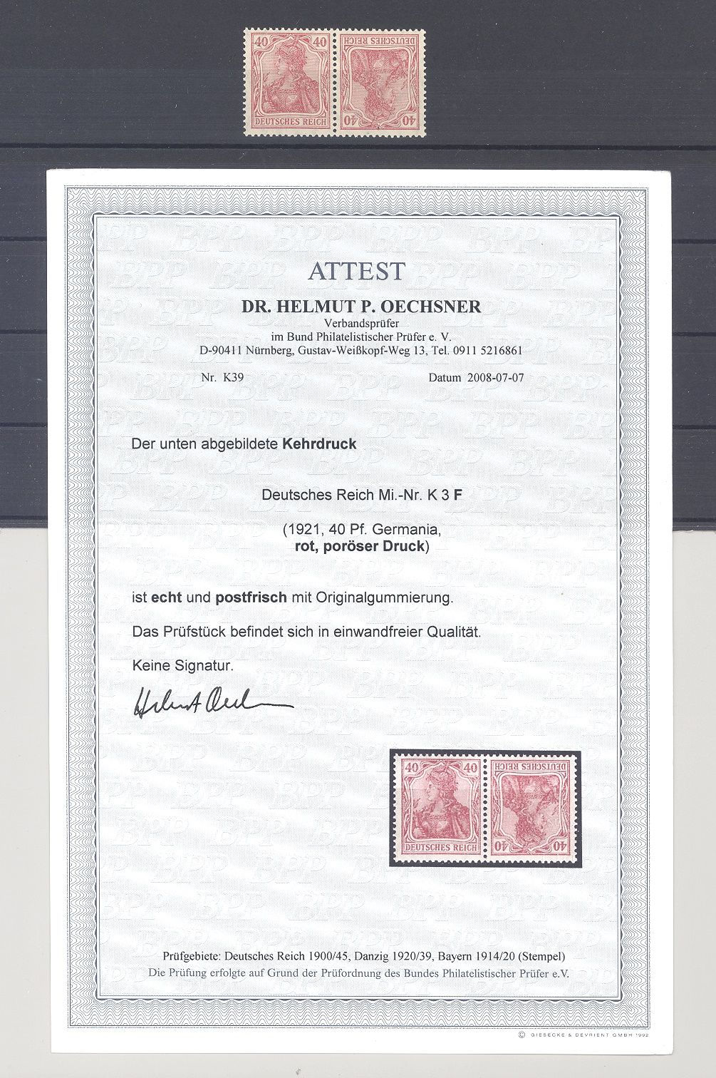 Deutsches Reich, der Germania Kehrdruck Zusammendruck KZ 3 F, 40 Pfg. Germania 1921 ** mit porösem Druck. Es liegt ein FA BPP vor, hat bereits einiges gekostet, ist mit eingescannt, der Michel beträgt nur -,-.