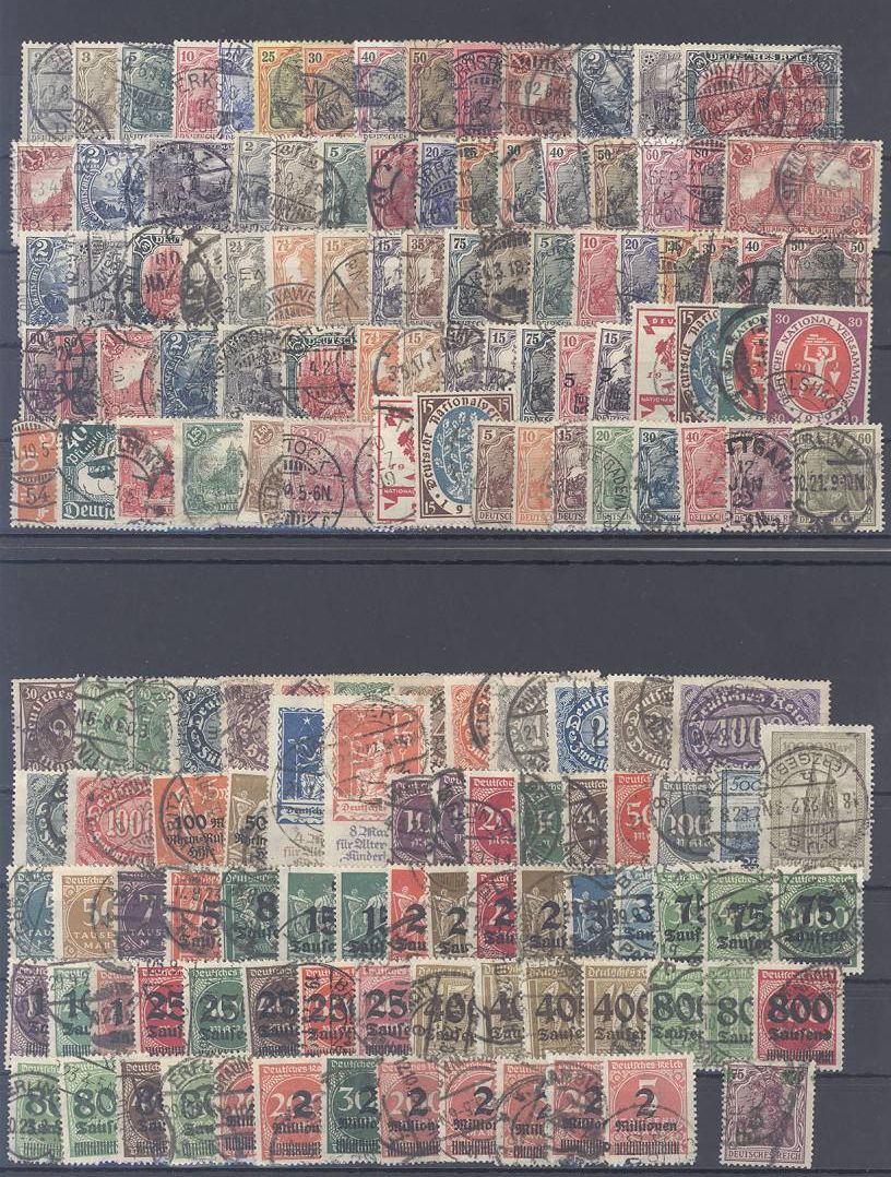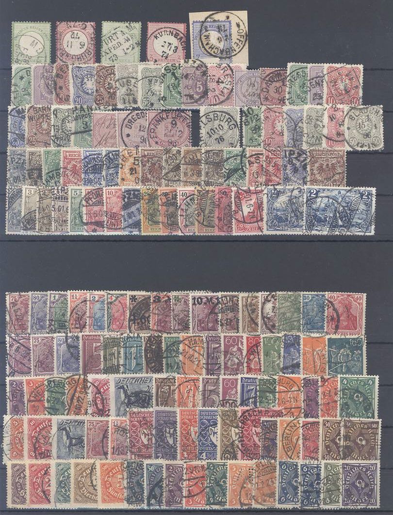 Deutsches Reich, umfangreicher gestempelter Posten ab Brustschilden auf vier Steckkarten, dabei auch Mi.Nr. 26, 36 Da und 64 II geprüft BPP, diese drei werten bereits mit 305,00 Euro, einfach zusammengesteckt. Sollte ein nettes Schnäppchen seinö