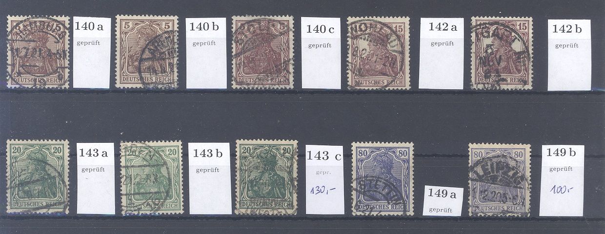 Deutsches Reich, gestempelter Posten aus Michel Nummer 140/49, Germania 1920, dabei auch Michel Nummer 143c und 149b, werten bereits mit 230,00 Euro. Jeder Wert ist geprüft, hat bereits einiges gekostet.