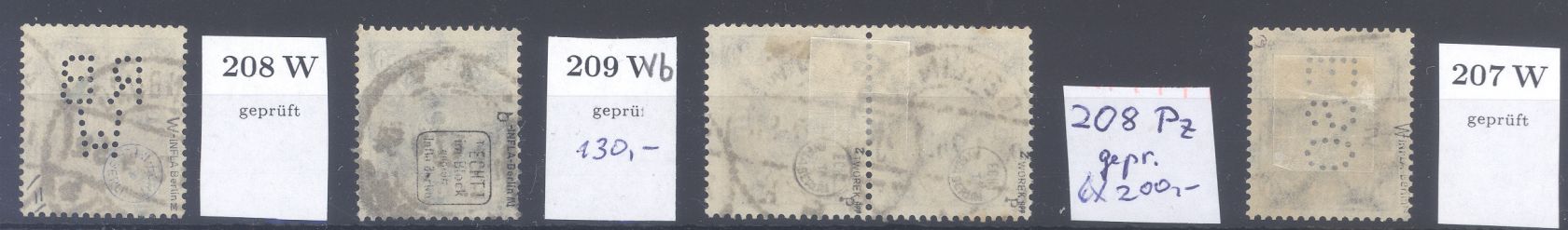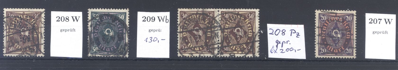 Deutsches Reich, gestempelter Posten aus Michel Nummer 207/09, Freimarken 1922 bestehend aus Michel Nummer 207W, 208W, 208 Pz im gestempelten Paar und 209 Wb. Jeder Wert ist geprüft.