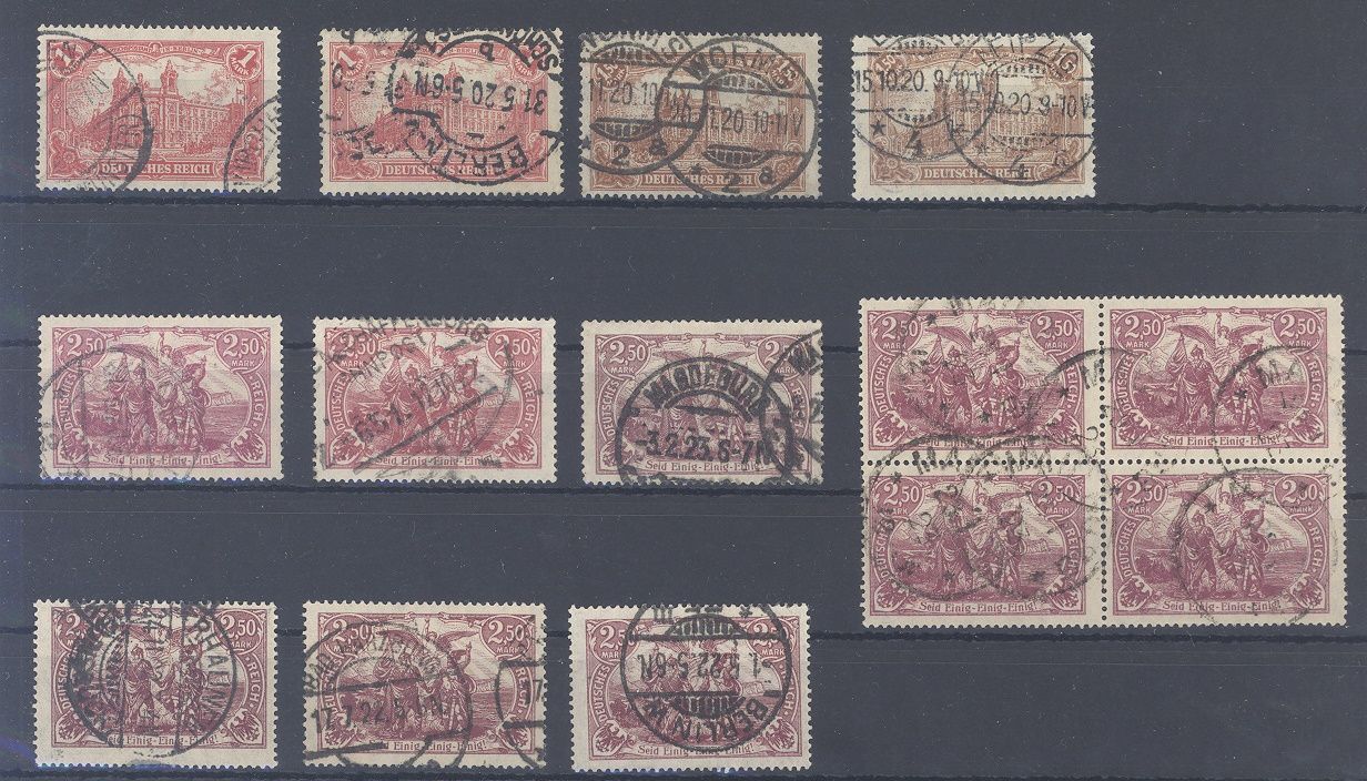 Deutsches Reich, gestempelter Posten aus Michel Nummer 113/15, Freimarken 1919/20 bestehend aus den Michel Nummern 113b, 113 IV, 114/b/c, 115 a/f und auch noch ein Viererblock der Michel Nummer 115e. Jeder Wert ist geprüft Infla, hat bereits einiges gekostet.