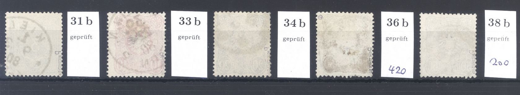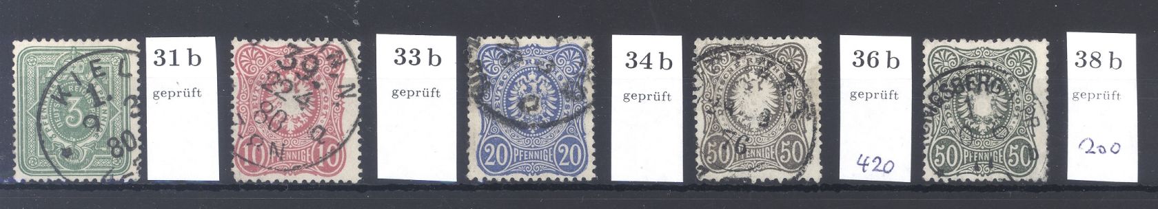 Deutsches Reich, gestempelter Posten Farben aus Michel Nummer 31/38, Adler / Krone 1875/79 in etwas unterschiedlicher Erhaltung. Es sind die Michel Nummern 31b, 33b, 34b, 36b und 38b vorhanden. Jeder Wert ist geprüft BPP.