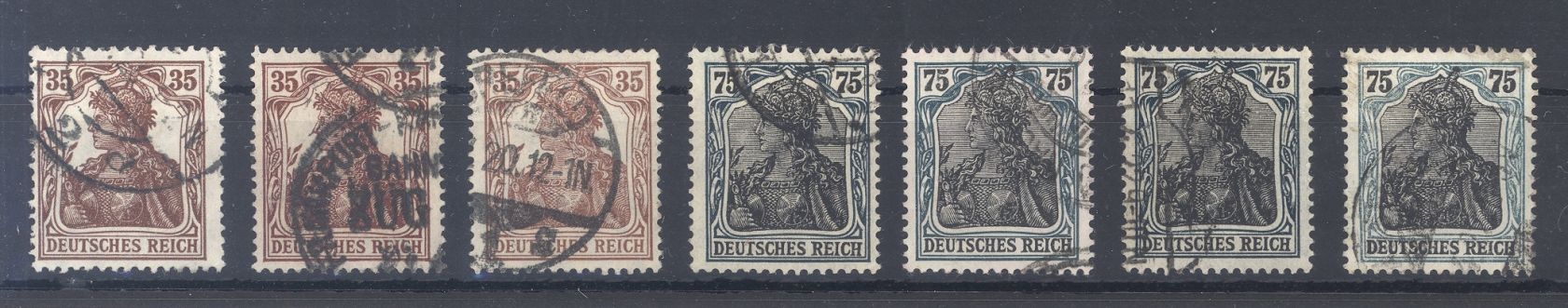 Deutsches Reich, gestempelter Posten Farben der Michel Nummern 102/04, Freimarken 1918, die Michel Nummer 104b hat noch das alte Prüfzeichen b F. Jeder Wert ist geprüft, nett einmal komplett angeboten.