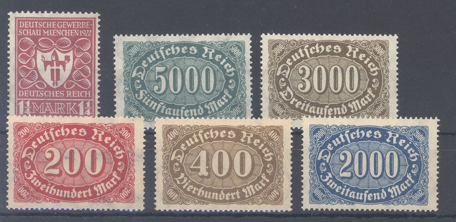 Deutsches Reich, kleiner ** Posten aus dem Jahr 1922 bestehend aus Mi.Nr. 199b, 222c, 248c, 254a und 256c. Jeder Wert ist geprüft.