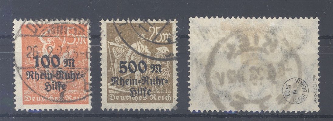 Deutsches Reich Michel Nummer 258/60, Rhein- und Ruhrhilfe 1923 gestempelt, der Hauptwert Michel Nummer 260 ist geprüft Infla.