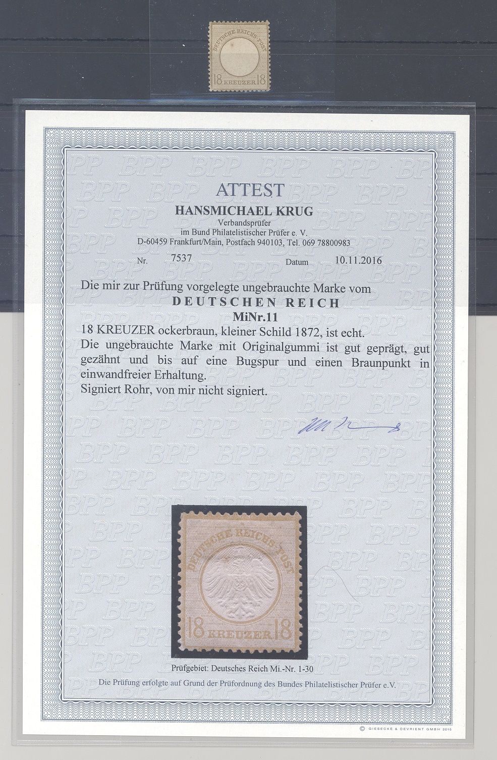 Deutsches Reich Michel Nummer 11, 18 Kreuzer kleines Brustschild ungebraucht * mit einem braunen Punkt, sonst ein sehr ordentlicher Wert. Es liegt ein FA BPP vor, hat bereits einiges gekostet, ist mit eingescannt, Seltenheit!