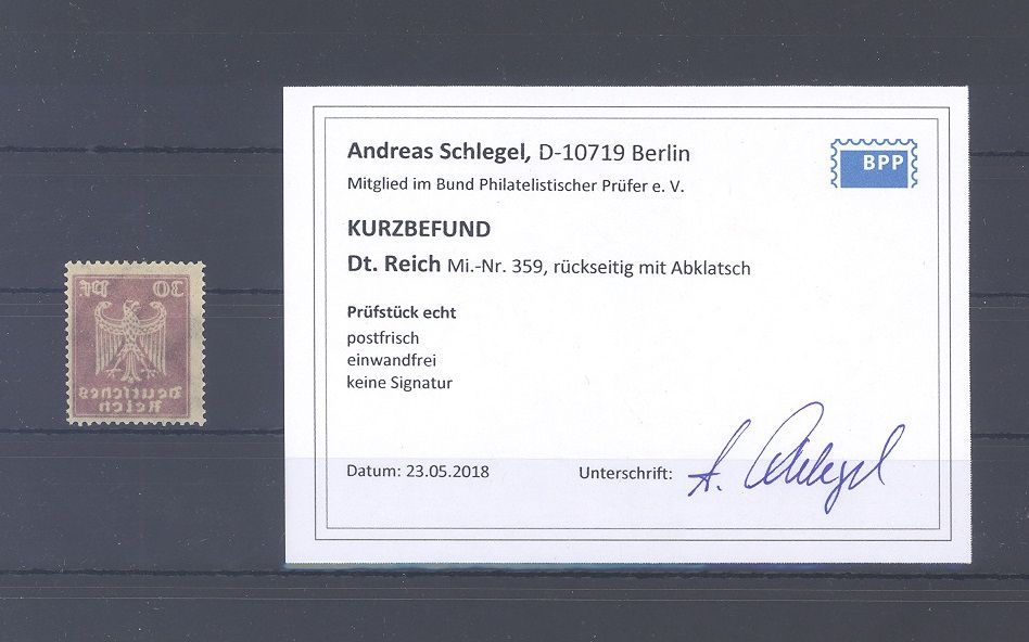 Deutsches Reich Michel Nummer 359, 30 Pfg. Reichsadler mit starkem rückseitigem Abklatsch **. Es liegt ein Befund BPP vor, ist mit eingescannt, hat bereits einiges gekostet, die Normalmarke wertet bereits mit 120,00 Euro.