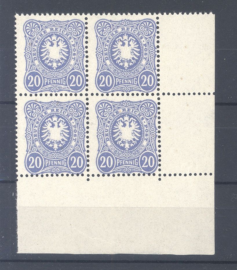 Deutsches Reich Michel Nummer 42 ba, 20 Pfg. Adler/Krone 1875/79 als schöner ** Viererblock sogar aus der Bogenecke. Es liegt eine Kopie des FA vom Schalterbogen vor, ist mit eingescannt. Sehr nett!