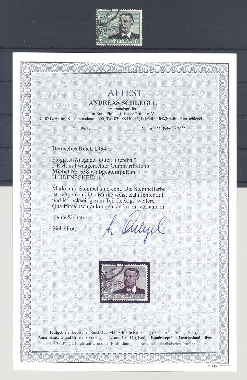 Deutsches Reich Michel Nummer 538y, 2 Mark Flugpost 1934 in der guten y Variante gestempelt mit kleineren Einschränkungen, insgesamt aber doch in ordentlicher Bedarfserhaltung. Es liegt ein FA BPP vor, ist mit eingescannt, hat bereits einiges gekostet, Seltenheit um Billigstpreis!