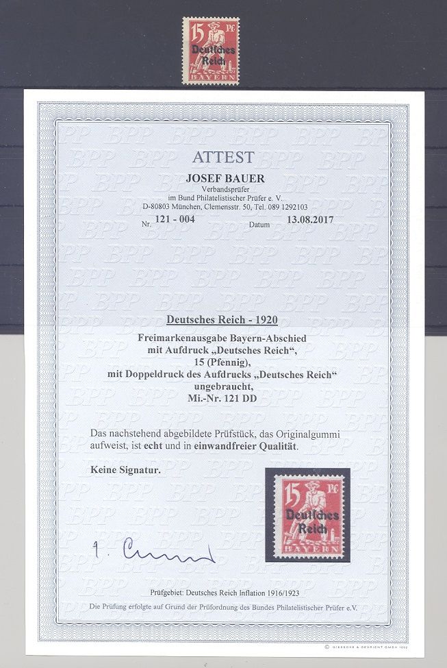 Deutsches Reich Michel Nummer 121 DD, 15 Pfg. Freimarke 1920 mit Doppeldruck des Aufdrucks ungebraucht *. Es liegt ein FA BPP vor, ist mit eingescannt, hat bereits einiges gekostet, der Michel passt hier wohl nicht.
