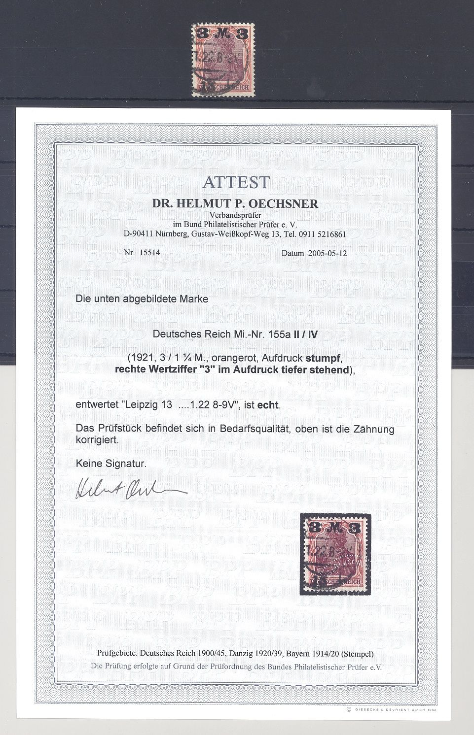Deutsches Reich Michel Nummer 155a II/ IV, 1 1/4 Mark Freimarke 1921 mit dem seltenen Aufdruckfehler IV gestempelt, oben etwas ausgebessert, sonst ein ordentlicher Wert. Es liegt ein FA BPP, hat bereits einiges gekostet, ist mit eingescannt, selten einmal angeboten!