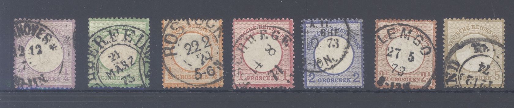 Deutsches Reich Michel Nummer 16/22, die Groschen Ausgaben des großen Brustschildes gestempelt. Ein ordentlicher Satz mit vielen sehr schönen Stempeln.