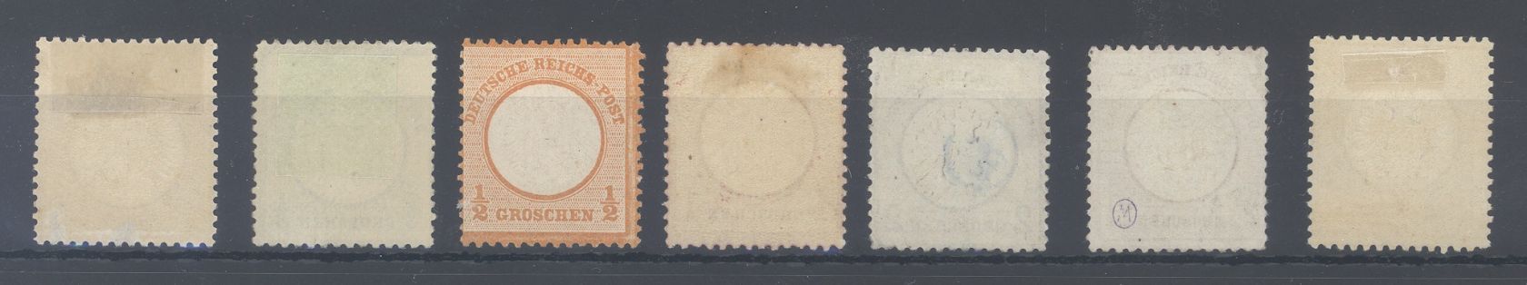 Deutsches Reich Michel Nummer 16/22, die Groschen Ausgaben des großen Brustschildes ungebraucht. Der Michel für komplett ungebraucht (*) beträgt 1.106,00 Euro.
