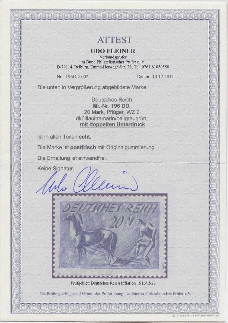 Deutsches Reich Mi.Nr. 196 DD, die 20 Mark Freimarke 1922 mit Doppeldruck **, ein schöner Wert. Es liegt ein FA BPP vor, hat bereits einiges gekostet, ist mit eingescannt, selten einmal angeboten!