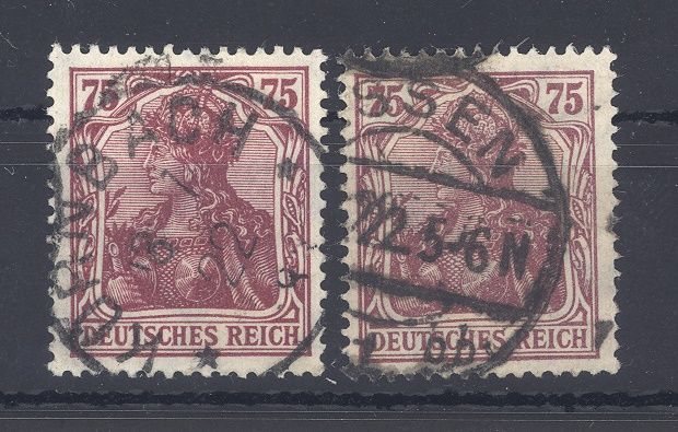 Deutsches Reich Michel Nummer 197b, 75 Pfg. Germania 1922/23 in beiden Farben gestempelt. Beide Werte sind geprüft, der Hauptwert ist geprüft BPP.