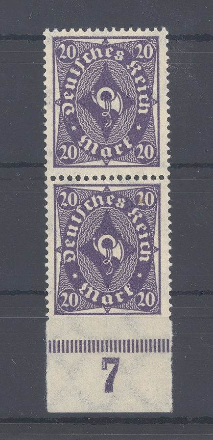 Deutsches Reich Michel Nummer 230 P Uu, 20 Mark Freimarke 1922 unten ungezähnt ** mit kleinem Stockfleckchen, sonst ein schönes Paar. Die Einheit ist geprüft BPP.