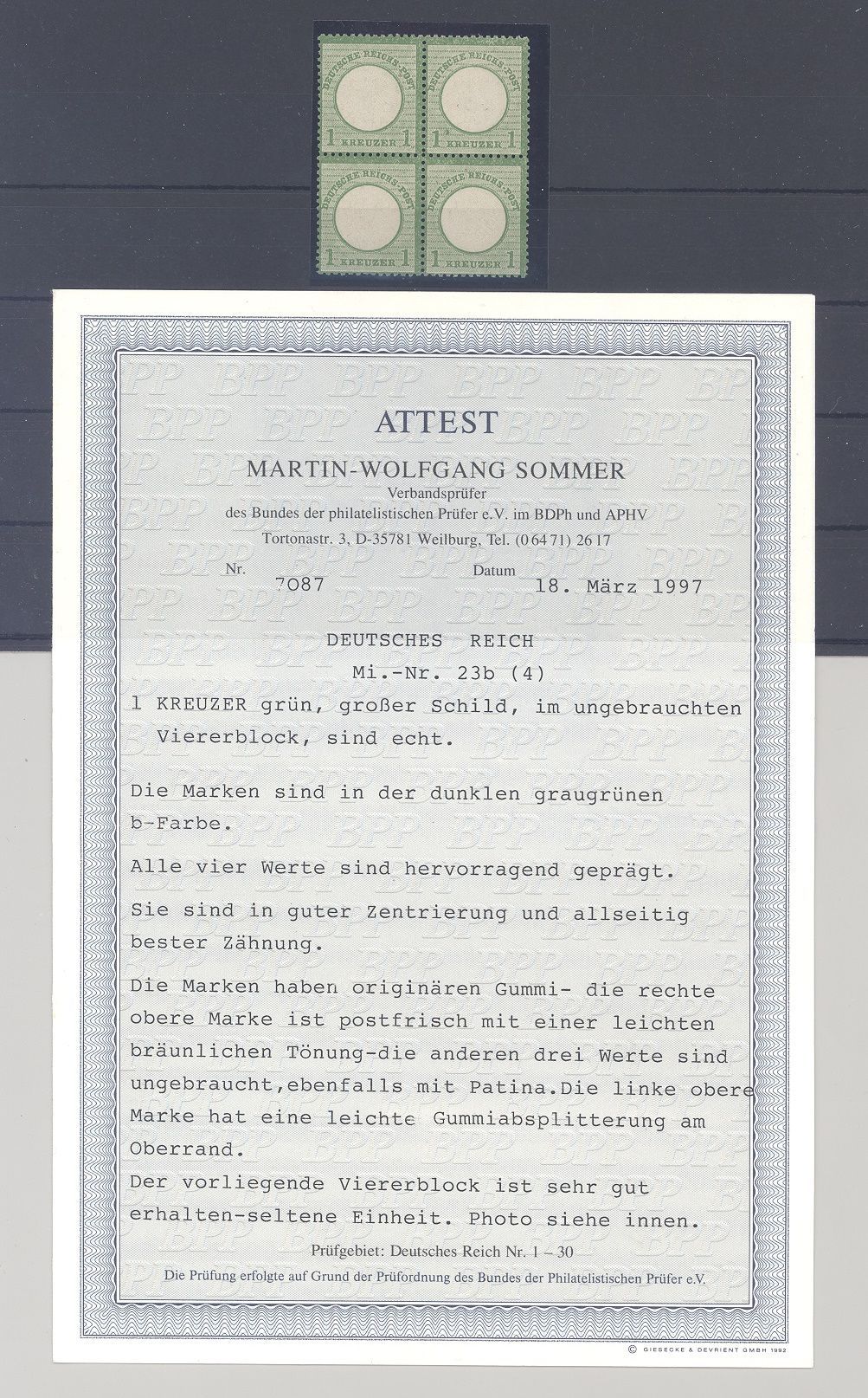 Deutsches Reich Michel Nummer 23b, 1 Kreuzer großes Brustschild in der guten Farbe b und zudem */** Viererblock mit ganz leichten Einschränkungen, aber hervorragend geprägt. Es liegt ein FA BPP vor, ist mit eingescannt, hat bereits eingescannt, der Michel für den komplett ungebrauchten * Viererblock beträgt bereits 2.400,00 Euro, echte Seltenheit!