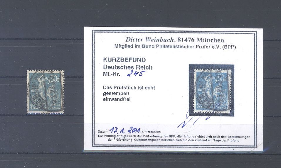 Deutsches Reich Michel Nummer 245, 50 M. Freimarke 1922 gestempelt. Es liegt ein Befund BPP vor, ist mit eingescannt, hat bereits einiges gekostet.