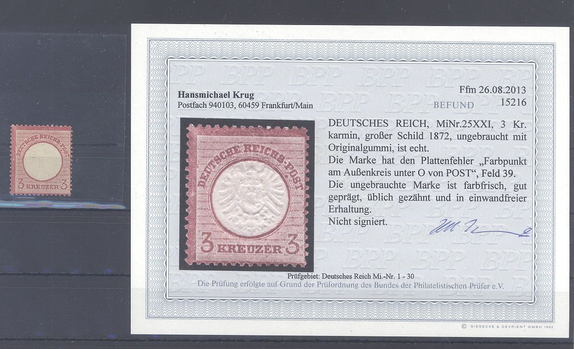 Deutsches Reich Michel Nummer 25 XXI, 3 Kreuzer großes Brustschild mit dem Plattenfehler XXI ungebraucht *, ein sehr ordentlicher Wert. Es liegt ein Befund BPP vor, ist mit eingescannt, hat bereits einiges gekostet.
