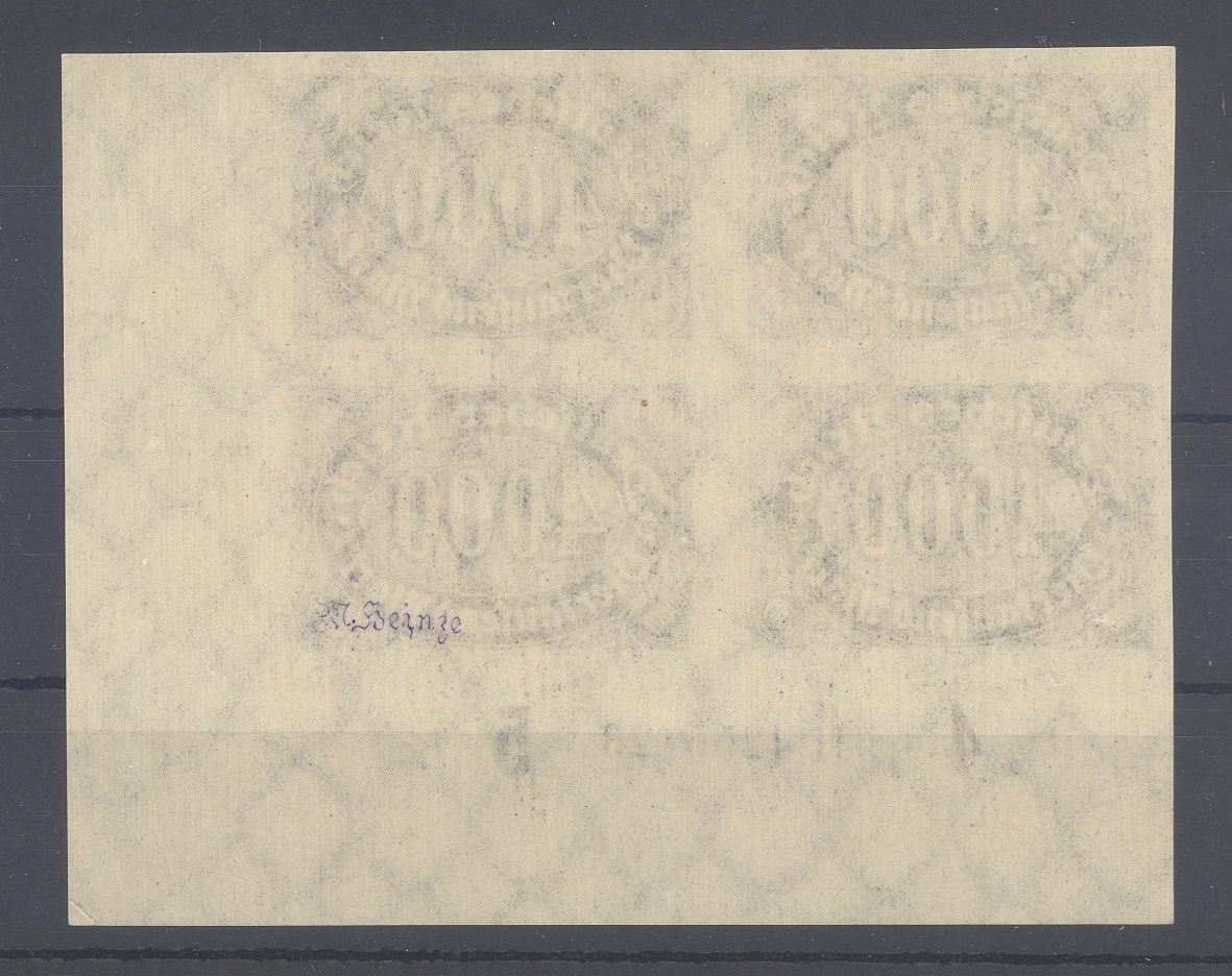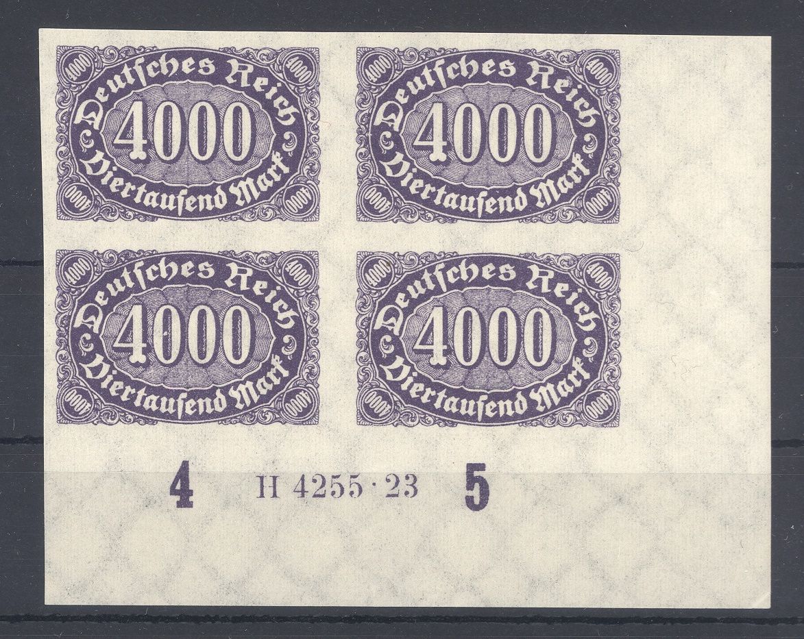 Deutsches Reich Mi.Nr. 255 U, die 4000 Mark Freimarke 1923 ungezähnt als ** Viererblock vom Eckrand und auch noch mit HAN. Die Normalmarken werten bereits mit 600,00 Euro, nette Ergänzung zur Sammlung!